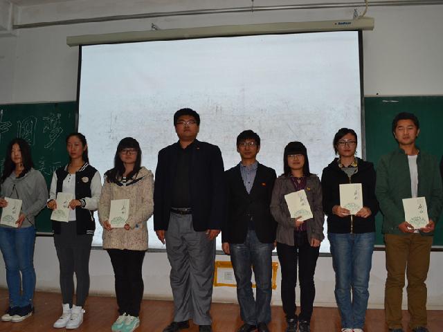 活动在雄壮的校歌声中拉开序幕。随后,由刘洋老师宣布学院关于增补和任命班委成员的决定。接着,在授书环节中,刘洋老师与吴兴识老师一起为新上任的班委授予由学校学生工作部编印的当代大学生励志书籍——《感动》。081301班班长孙超群代表2013级班委发言,他代表13级全体班委表达了要真心真意为同学们服务的决心,同时希望全体班委能加强自身修养,提高个人综合素质,更好地为同学们创造一个良好的生活和学习环境。 随后,与会人员一起观看了吉林大学2012年度“自立自强大学生”事迹展播和“十佳大学生”事迹展播,学习了他们的先进事迹。每一个榜样的故事都有着强大的精神力量,让在场的每一个人备受鼓舞。承担起家庭重任却依旧能保持优异成绩的闫世创,身残志坚、乐观生活的王亚南,面对生活中磨难挫折、坚强生活的李爽,勤工俭学、只希望通过自己的努力让家人过得更好的皇甫凤……一个个优秀的吉大学子用他们的实际行动诠释了“求实创新 立志图强”的校训,感染了在场的许多同学,让大家明白了奋斗的青春才是最美丽的。