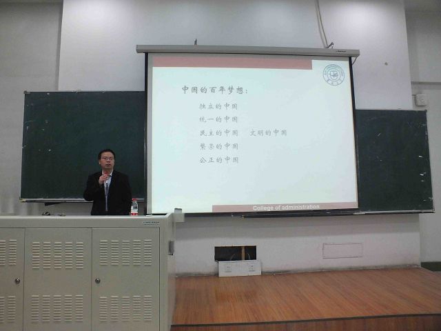 殷冬水副院长从政治学的专业视角深刻解读了“中国梦”的内涵,他指出,中国的百年梦想从历史发展脉络看是“五位一体”的,即“独立梦”、“统一梦”、“民主梦”、“繁荣梦”和“公正梦”,而最终统一为“文明梦”。只有主权国家的建立,共同意识的形成,民主化程度提高,国家富强与繁荣以及社会公平正义才能实现中华民族伟大的中国梦。针对如何建立公正的社会,他分别从当代中国社会不公正的发生逻辑、社会不公正的政治因素以及当代中国社会不公正的治理三个维度进行了专业的分析,使同学们从政治学视角出发更加深入的了解了当今社会的公正问题。在讲述当代社会不公正发生的原因时,他系统分析和归纳了学术界的不同论点,并总结为“自然差异论”、“市场改革论”、“政府政策选择论”、“政府权力失控论”和“全球化论”五个方面,使同学们全面的了解了学术界对社会不公正产生原因的观点和看法;他还基于政治学的研究视角认为“利益表达失衡”是当代中国社会不公正产生的政治因素,并从中国弱势群体的“失声”以及强势群体的“控制”两个方面进行了具体阐述,着力强调“利益表达失衡产生、加剧和固化了当代中国的社会不公正”这一论断;他最后对当代中国社会不公正现象的治理提出了几点建议,他认为提高国家的自主性与提高政府觉得的民主化水平是解决社会不公正现象的重要途径。讲座后,他还针对同学们的疑问和困惑进行了耐心的回答与解释,同学们深为他诙谐幽默的语言、平易近人的态度、睿智缜密的思维以及深厚扎实的理论功底所钦佩。