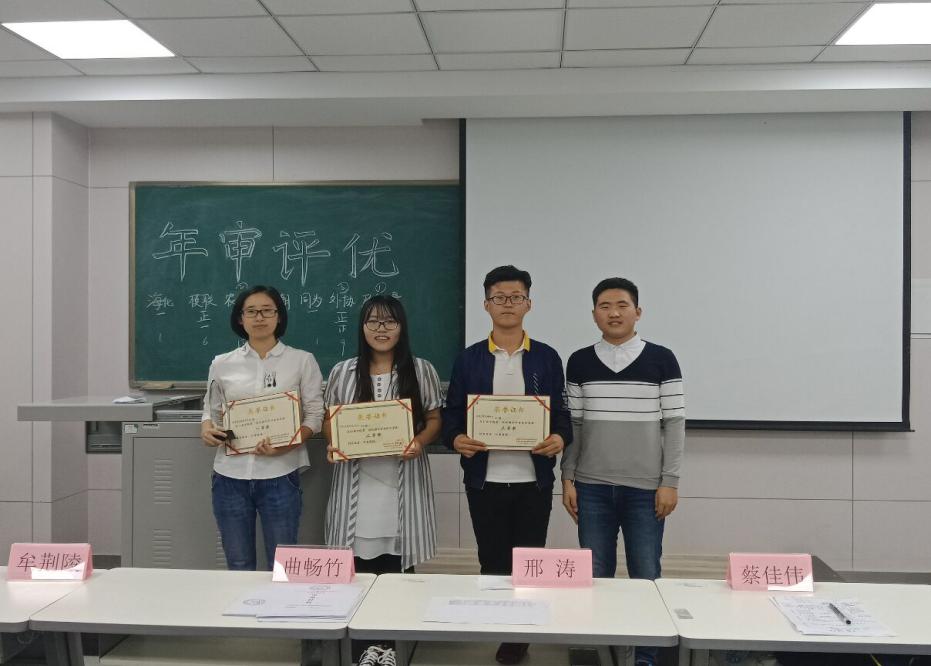 外语协会分获二、三等奖,模拟联合国协会、思潮学社、海化社、同为社获优秀奖;社团负责人孙月、王翔宇、张萌荣获“优秀社长”称号,邹蓉、赵娅丽荣获“优秀团支书”称号。在随后的颁奖环节,曲畅竹上台为获奖人员颁奖,并就社团的建设发展等方面的问题向大家提出了建议;社联主席邢涛、副主席兼管理部部长蔡佳伟对本次年审评优答辩作了总结。