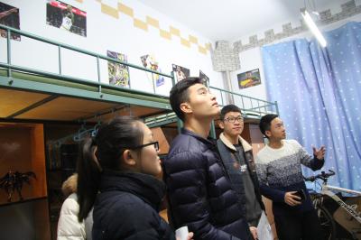 本科生辅导员曲畅竹和学生会的工作人员走进2016级学生寝室参观,并对寝室布置所展现出的寝室文化进行了点评和打分。