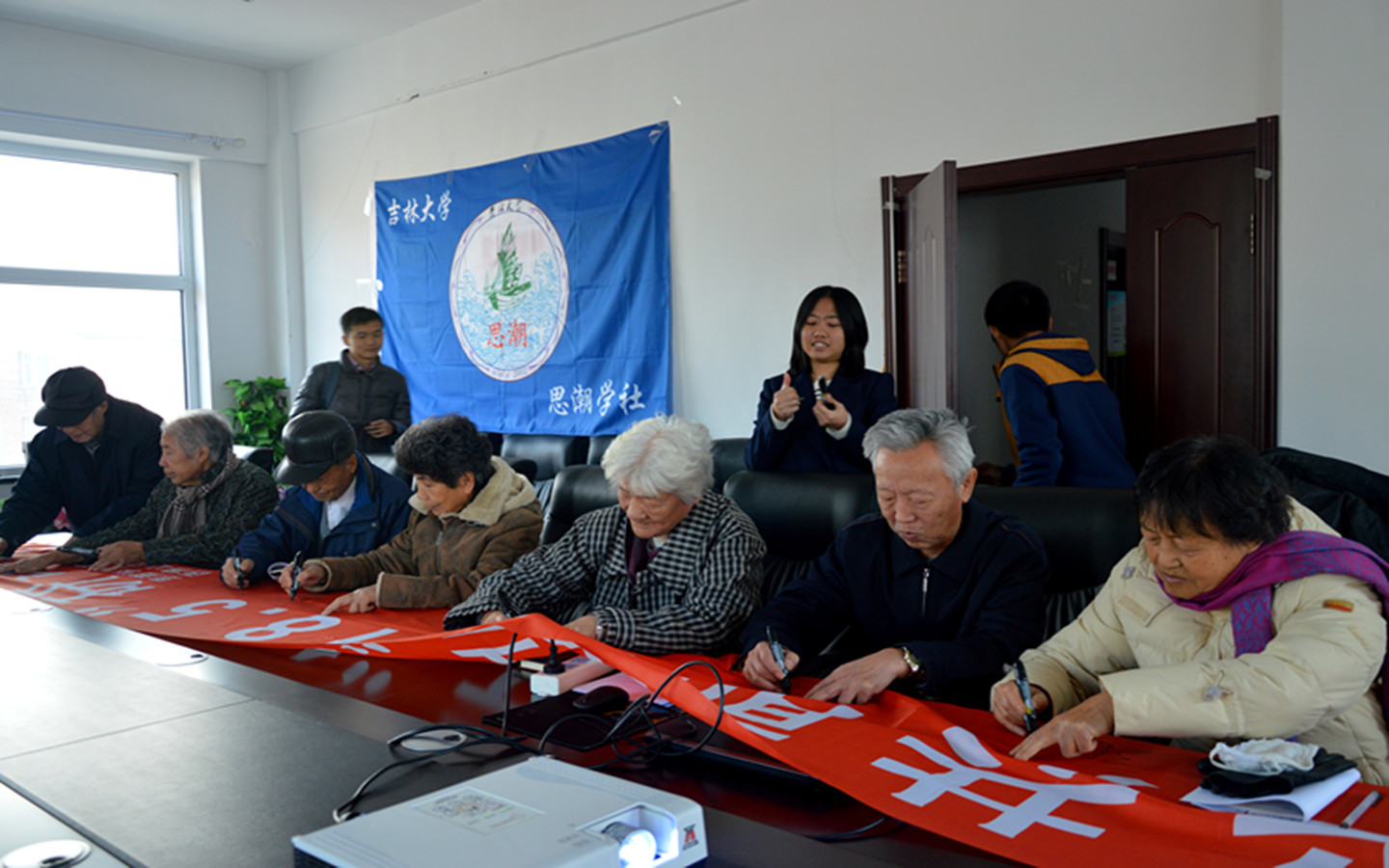在经过细致周密地准备之后,研讨会在上午10点准时开始。首先,王佳佳用视频、幻灯片等资料对十八届五中全会背景、主题作了简单的介绍。随后的自由发言环节,大家各抒己见,分享自己对于全会的理解。其中2012级本科生万辰光用专业知识对全会公报中的五个发展(创新发展、协调发展、绿色发展、开放发展、共享发展)表达了深刻见解;2013级本科生赵赵德昊则从大学生的角度解读了五中全会公报,引起了在场的学生的普遍共鸣。之后,在场的东光社区老党员也表达了对于全会的独特见解。其中一位退休老教师就普及高中阶段教育的内容上谈到,对于建档立卡的家庭经济困难学生的学杂费免除和实现资助全覆盖,彰显了中央重视教育公平和惠民生的战略举措。研讨会结束之后,全体参会人员在活动条幅上签名留念。