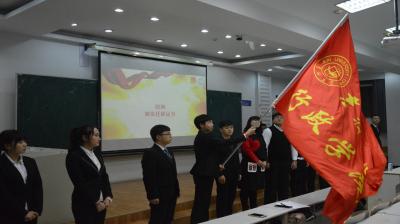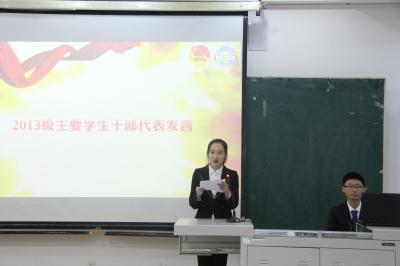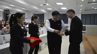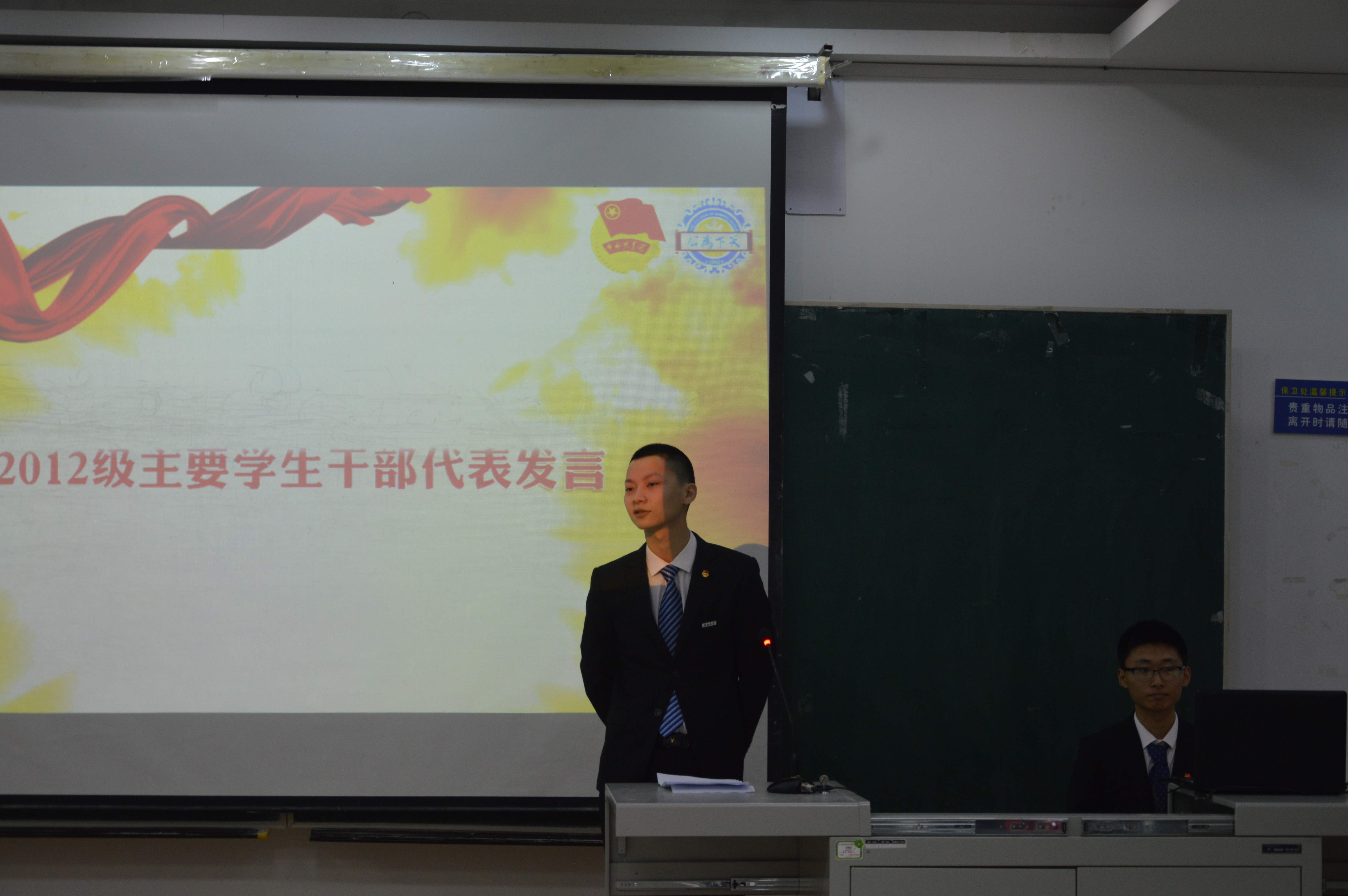 学生干部、单项奖学金获奖者、2015级各班班委成员以及学院所属各社团负责人等同学的名单。在大会第三项的进程中,分别由两位不同年级的学生干部代表进行了发言。首先,原团委副书记姚晗(2012级)在感谢学院老师的培养和同学们的信任的同时,结合自身在校经历与生活,向在座同学分享了他所理解的大学生应具有的素质和使命。他提到,当代大学生必须树立责任意识与奋斗意识,在建立更高维度的统筹思维能力的同时,要把握高速发展的社会环境所提供的发展机遇,在大学生活的平台中发挥自己的才能,坚持到底、永不言弃。随后,学生会主席王雨萍(2013级)结合学院实际提出了一名合格的学生干部应具备的条件。她谈到,学生干部应首先明确自身工作性质的定位,树立在工作中的服务意识和公仆意识,并时刻发挥好学习工作等领域的模范带头作用,为学院的工作保驾护航。两位代表发言后,大会第四项随即开始。首先刘洋、曲畅竹与2012、2013级主要学生干部进行了本学年学生组织的授旗仪式;而后刘洋为2013级主要学生干部颁发任职证书,曲畅竹为院级优秀学生干部、单项奖学金获得者、2015级各班班委以及2014级学院社团负责人颁发荣誉证书。最后,大会第五项,全体参会成员起立合唱了共青团团歌。