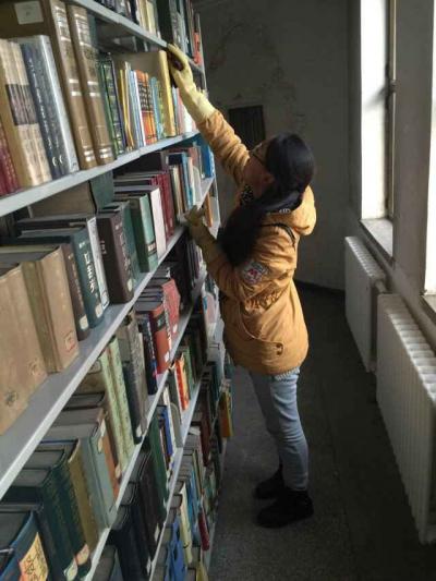 下午1时许,081503、081504班同学顺利到达长春市图书馆。3班主要负责旧书储藏室的清洁工作。在3班班长李克柔(2015级)进行短暂的分工后,同学们立即投入到了工作当中。女生们都小心翼翼地擦拭旧书,以避免旧书被沾湿受潮;男生们将一桶桶沉重的水提上楼后,便加入到了拖地的队伍中去。4班主要负责图书的整理工作。4班班长郑杰(2015级)针对工作的内容将班级同学分成了五个小组。其中,第一、二组主要负责期刊的初步整理,即把期刊按照月份的顺序下架、归类;第三、四组负责期刊的进一步整理,主要是将初步整理的期刊按照一定的顺序进行捆扎;第五组主要负责后期工作,收集已整理好的期刊并运送到指定的储存点。同学们配合默契、干劲儿十足,志愿服务工作提前完成,并获得图书馆负责人的好评。