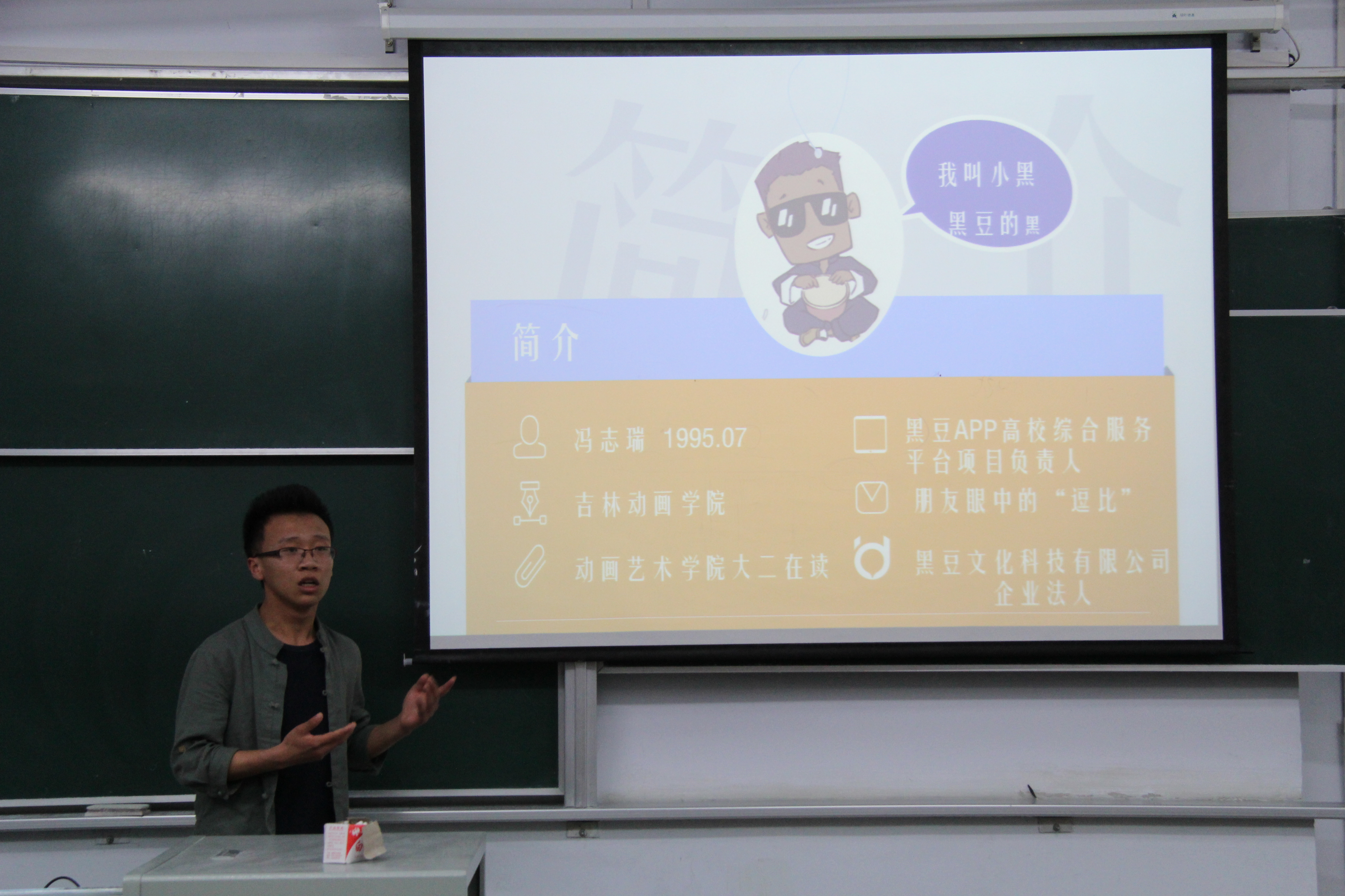 2013级本科生,学院培育的“首届中国“互联网+”大学生创新创业大赛”参赛项目负责人)和长春黑豆文化科技有限公司法人代表冯志瑞(吉林动画学院动画艺术学院2013级本科生)向到场本科生分享各自创业经历、“互联网+”创新创业项目和创新创业经验、心得与体会,展示创新创业学子风采,畅想“互联网+”创新创业愿景,启迪大学生创新创业智慧,精心准备、现身说法,为到场师生带来了一场别开生面、催人奋进的创新创业教育和体验。