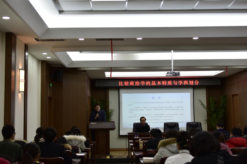 讲座伊始,马雪松教授简要介绍了李路曲教授的学术经历、学术地位与学术贡献。李路曲教授围绕主题,从““方法论”、“本体论”、“研究议题”之争,议题与方法的变迁,学科内涵的交叉与划分,基本特质与学科划分标准的统一”四个方面为在场师生带来了一场学术盛宴。学界对于比较政治学的定义多种多样,李路曲教授从“方法论”、“本体论”、“研究议题”“综合论”四种常见观点对比较政治学的定义与内容进行阐释。不同观点的产生与比较政治学议题的变迁和研究方法的创新有直接的关系,李路曲教授认为,新兴民族国家的出现推动了比较政治学议题的变化,而理论与方法的发展也改变着比较政治学的内涵。总体上,比较政治学经历了从对西方主要国家政府和宪法的研究到对非西方制度及意识形态的研究的变迁。